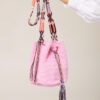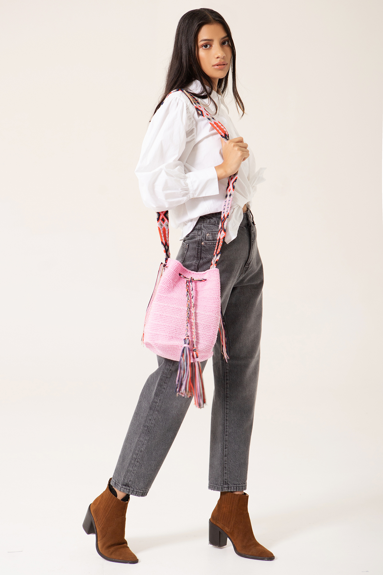 Bolso tipo bandolera tamaño mediano, tejido en hilo de seda, super resistente, cuerpo color rosa y asa en marino, naranja y blanco con figuras geométricas, Un modelo 100% artesanal.