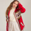 Cardigan capucha color rojo, de lana con alpaca, super suave y calientito. Con estampado de grecas y alpacas en tonalidades otoñales a contraste. Este modelo es UNISEX.