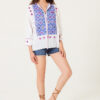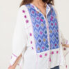 Cardigan confeccionado en manta de algodón color blanco, con bordados en telar de cintura en la parte frontal color azul rey con beige. Prenda 100% artesanal.