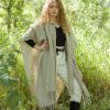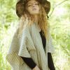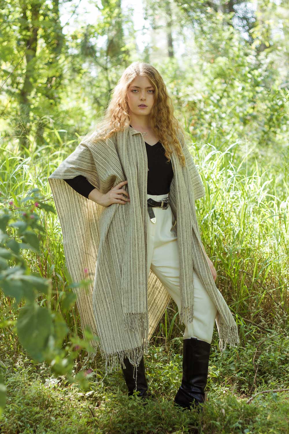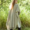 Poncho lana largo en color crudo con rayas grises, botones de madera y lazada en parte frontal. Diseño con aberturas en laterales y deshilado trenzado en parte inferior.