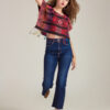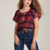 Croptop confeccionado en telar con estampado en forma de grecas y deshilado en bajos. En color rojo parte frontal y negro parte trasera.
