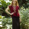 Chaleco tipo torera con tela confeccionada en telar de cintura con grecas en color negro y rojo. Bordados a mano con hilo en color arena en todos los bordes y deshilado en parte baja. Prenda 100% artesanal..