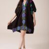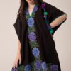Túnica de algodón en color negro, con bordados florales de hilo luminoso en parte frontal y bordes, incluye pompón doble en parte lateral . Una prenda 100% artesanal.
