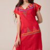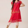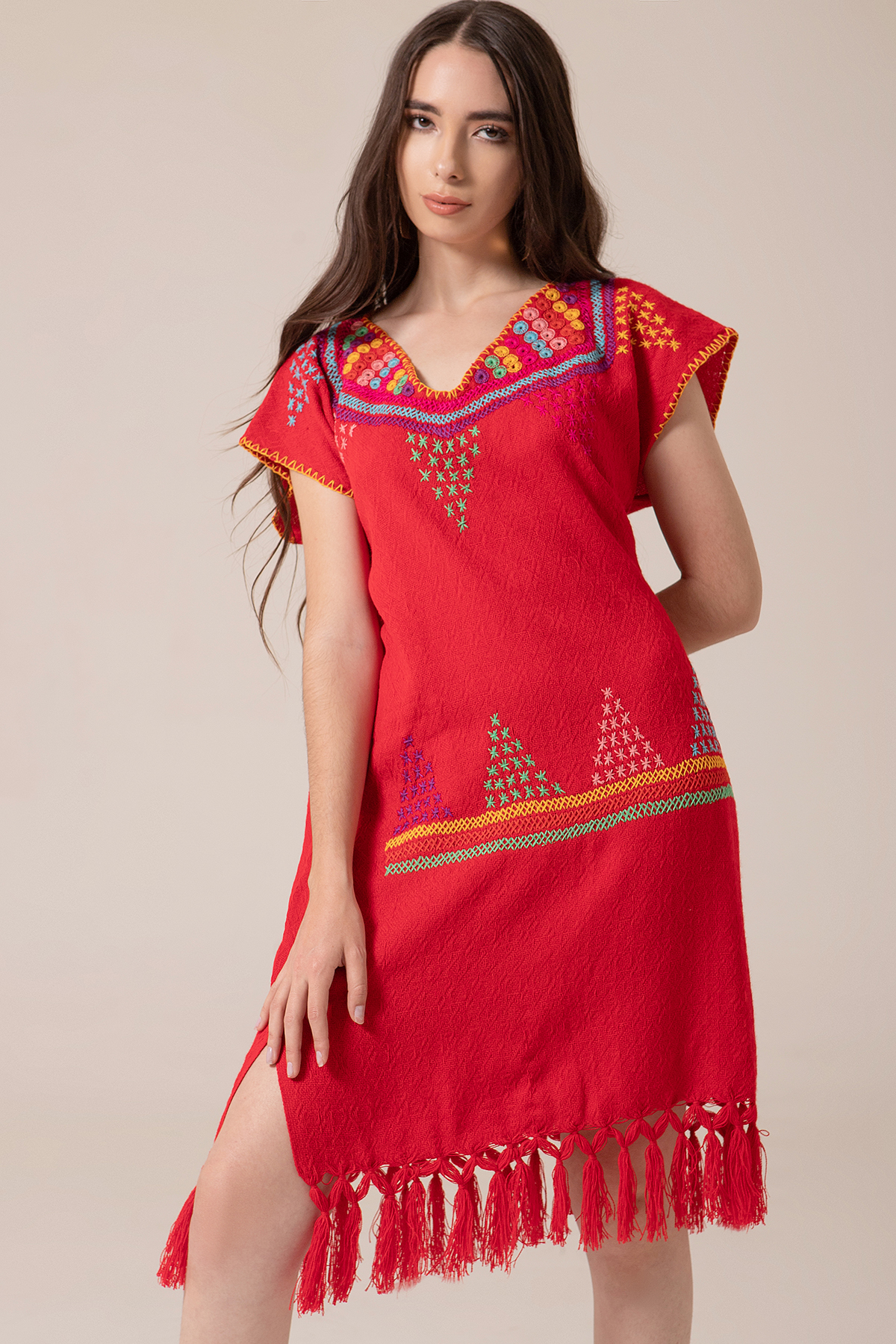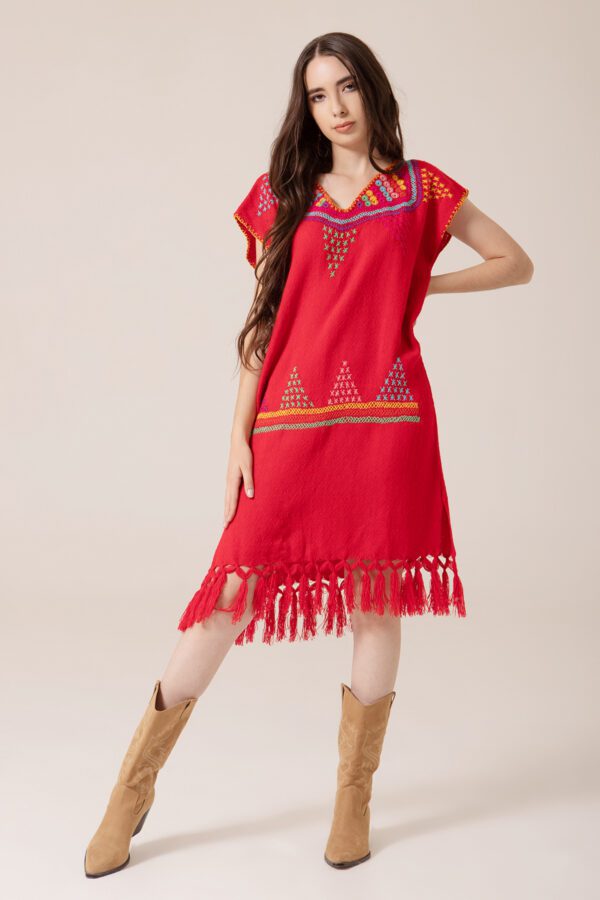 Vestido midi color rojo, con flecos en parte baja. Bordados a contraste en formas geométricas en toda la parte frontal. Una prenda 100% artesanal.