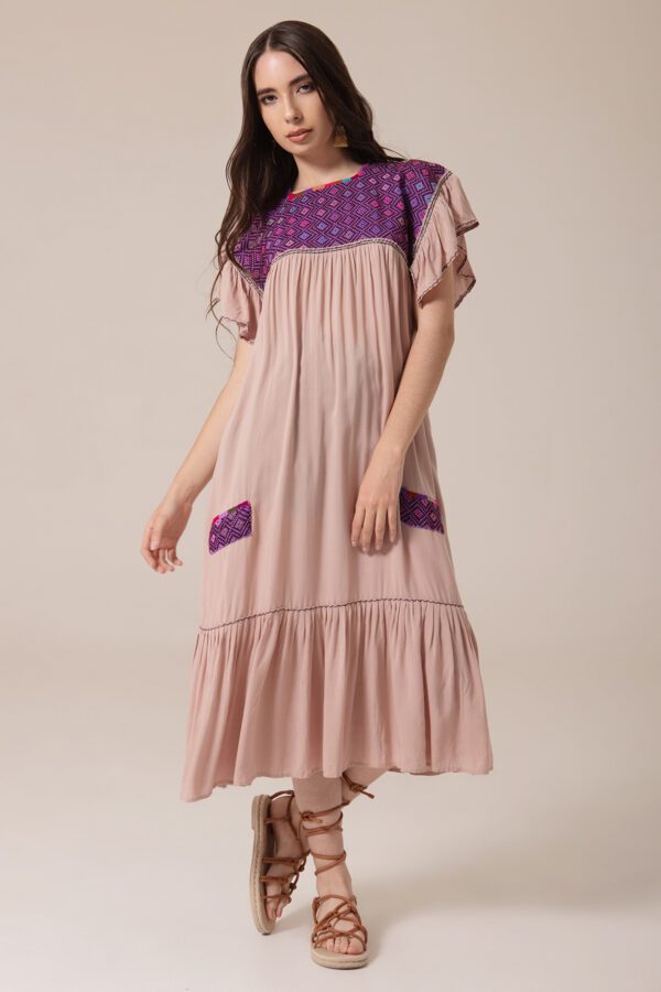 Vestido viscosa color beige con pechera telar con tonalidades lilas, largo midi, manga corta fluida y bolsillos montados en parte frontal, muy ligero para este verano . Una prenda hecha por artesanos mexicanos, en la región de San Cristobal de las Casas, Chiapas.