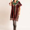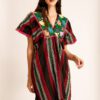 Vestido negro con rayas en color rojo y verde con hilo luminoso, con bordes y pechera bordada punto de cruz en forma da aves, con tonalidades a contraste. Manga corta, con desflecado en bajos . Una prenda típica de la región de Chenaló, Chiapas.