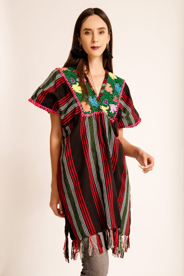 Vestido negro con rayas en color rojo y verde con hilo luminoso, con bordes y pechera bordada punto de cruz en forma da aves, con tonalidades a contraste. Manga corta, con desflecado en bajos . Una prenda típica de la región de Chenaló, Chiapas.