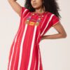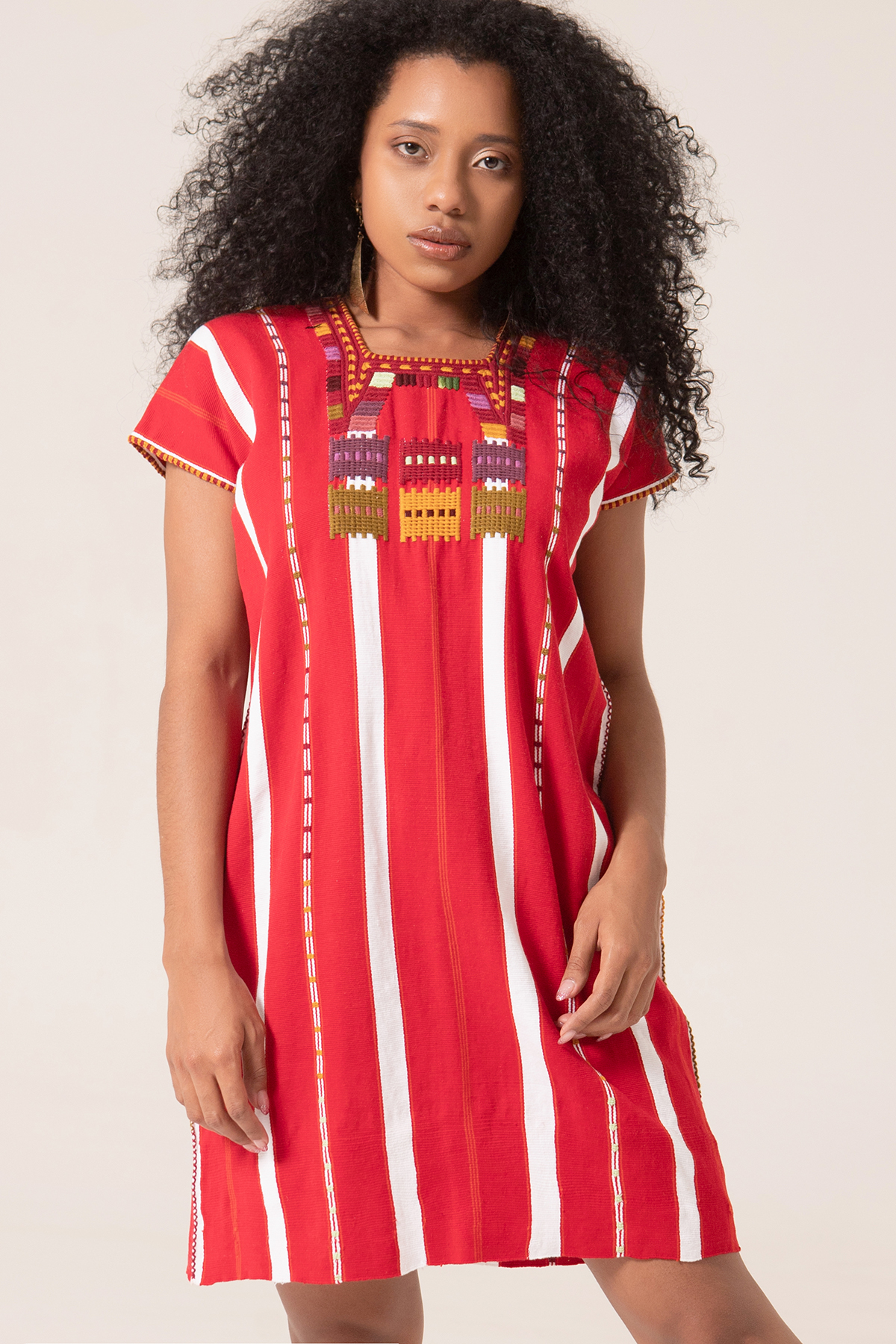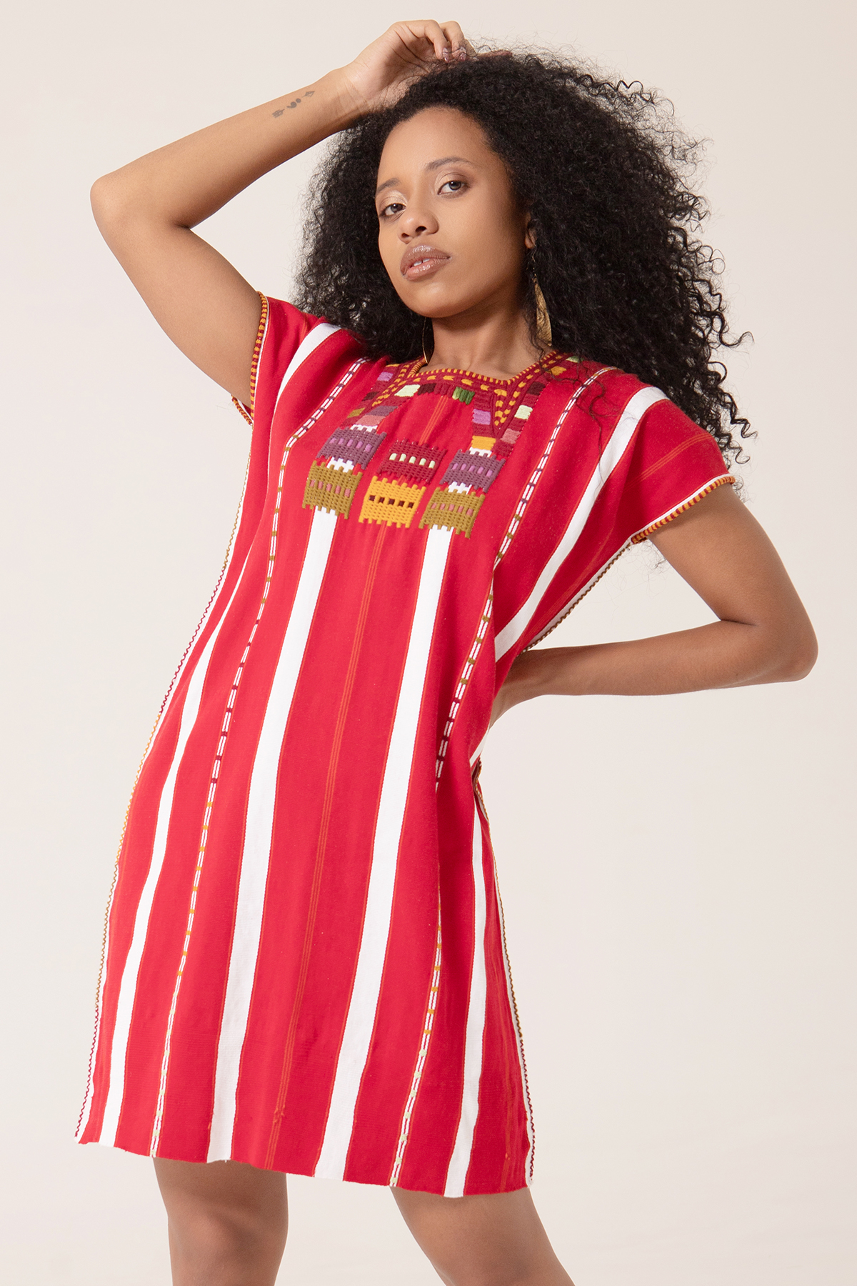 Vestido corto franjas, confeccionado en telar de cintura, con bordados geométricos en parte frontal a contraste, fondo color rojo con blanco . Una prenda típica de la región de Pantelho, Chiapas. Medidas 60 cm de ancho ( medida de frente ) x 88 cm de largo